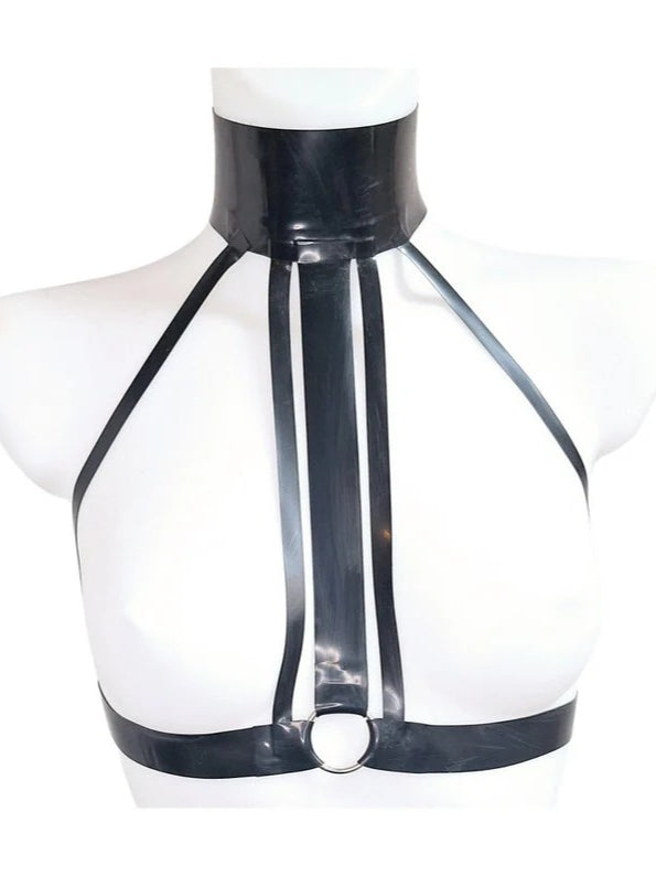 The perfect Latex harness to add to your outfit. Starting with the the heavy Latex wide choker finished with gunmetal poppers, attached to a trio of straps from neck to an O ring on the band. 2 more latex straps frame the breast area.