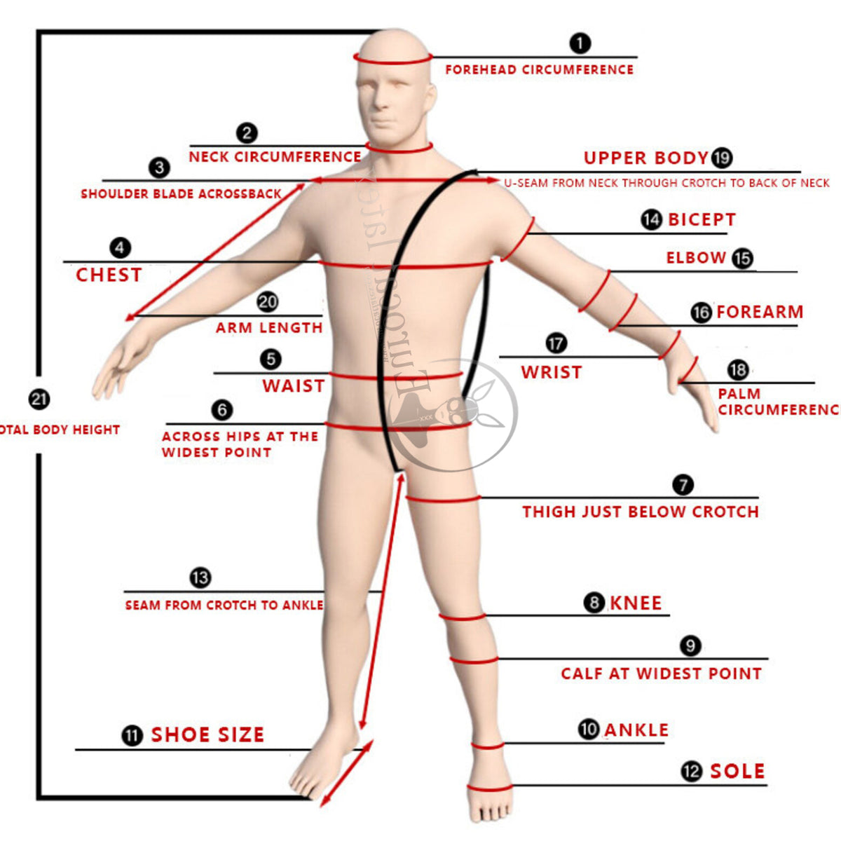 Zunächst einmal ist es am besten, barfuß in Unterwäsche zu stehen. Um optimale Ergebnisse zu erzielen, nehmen Sie Ihre Messungen ein paar Mal vor oder lassen Sie sich von jemand anderem messen. Achten Sie darauf, das Maßband nicht zu locker zu halten oder es zu straff zu ziehen. Nachfolgend finden Sie einige der gängigsten Maße, die wir bei der Bestellung oder bei der Überprüfung Ihrer Größe benötigen, bevor Sie aus Konfektionsartikeln wie Extra Small, Small, Medium usw. auswählen.